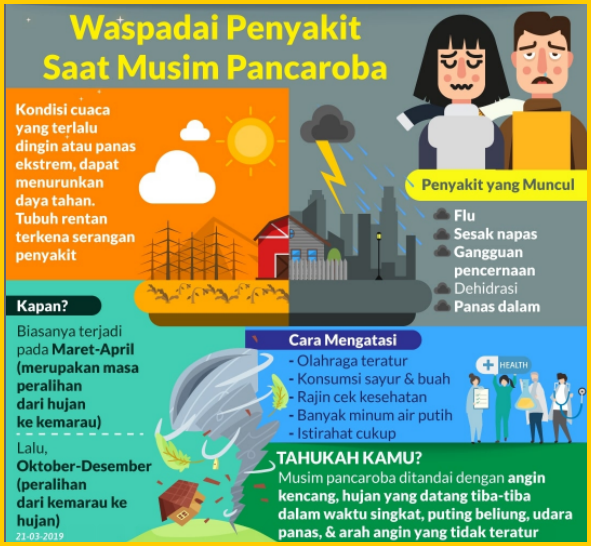 “Musim saat ini memang tidak menentu kadang tiba-tiba hujan panas memang kalau di anak tren penyakit yang sering muncul pada saat ini paling banyak yaitu batuk dan pilek ISPA kasus diare ada beberapa kasus demam berdarah untuk kasus ISPA sendiri atau infeksi saluran nafas akut biasa ditandai batuk dan pilek pencegahannya menghindari makanan yang pemicunya salah satunya seperti mengurangi mengkonsumsi makanan yang dingin.” Kata Dr. Yuliana.