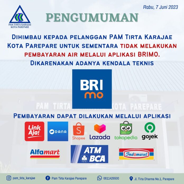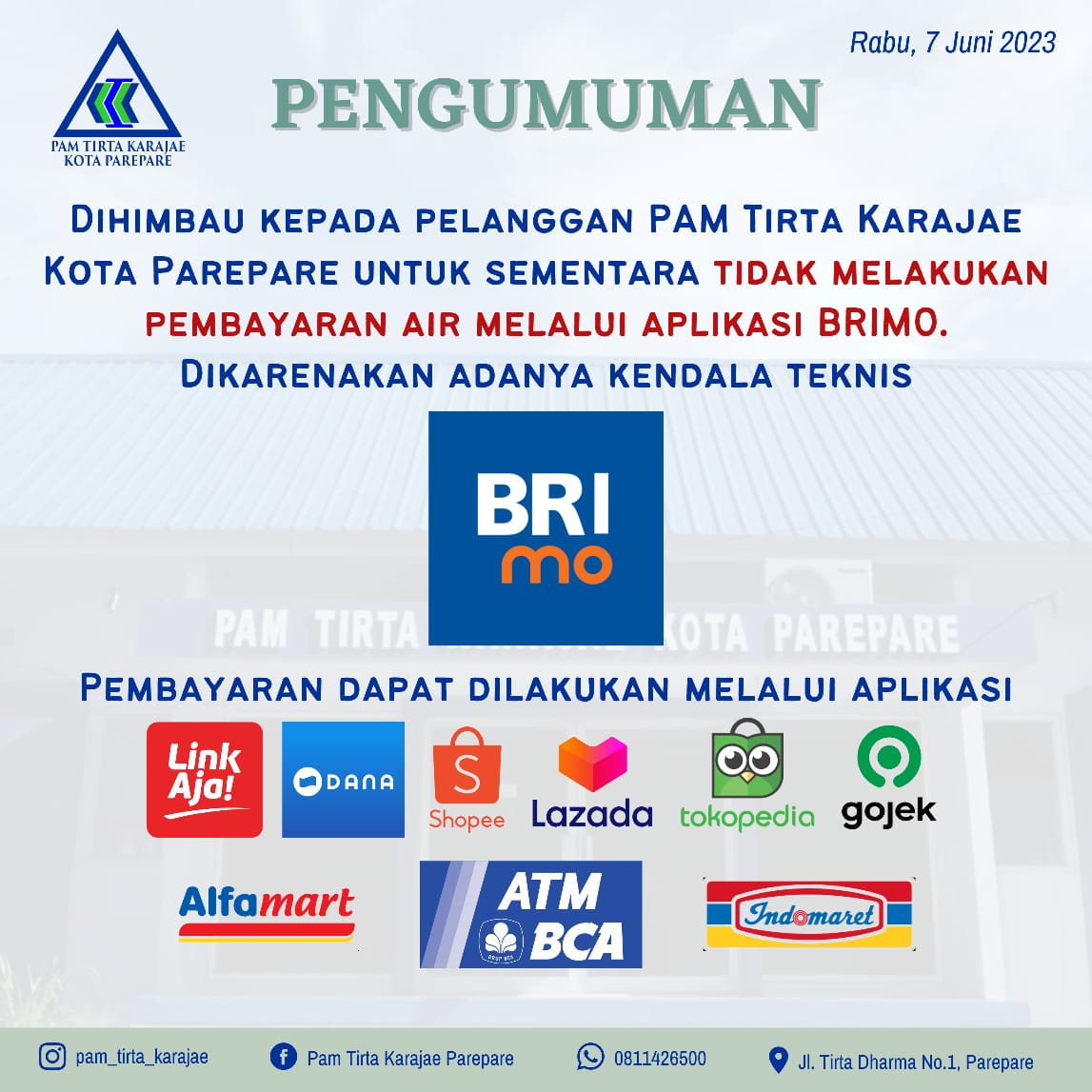 ‘Berhubungan Adanya beberapa komplain dari pelanggan PAM Tirta karajae terkait dengan pembayaran tagihan rekening air melalui aplikasi brimo pada menu pembayaran PDAM, maka dengan ini kami dari PAM Tirta karajae kota Parepare mengimbau kepada seluruh masyarakat kota Parepare khususnya pelanggan PAM Tirta karajae agar tidak menggunakan menu pembayaran PDAM pada aplikasi brimo  untuk melakukan transaksi  pembayaran tagihan air PAM Tirta karajae. Hal tersebut dikarenakan ada gangguan teknis pada aplikasi tersebut.” Kata Erfendy.