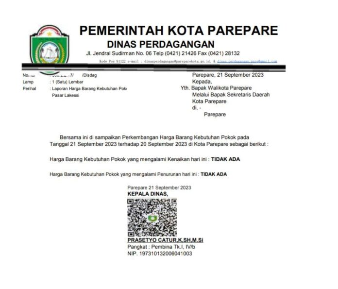 PAREPARE,RADIOMESRA. COM – Dari hasil pantauan tim Dinas Perdagangan (Disdag) Kota Parepare, Kamis (21/09/23) , Seluruh harga bahan pokok (bapok) tidak mengalami kenaikan maupun penurunan.