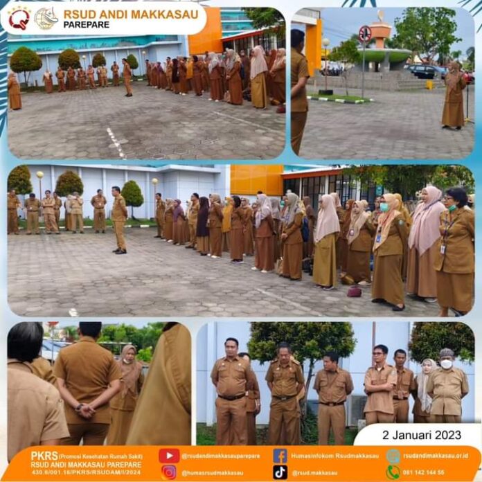 PAREPARE, RADIOMESRA. COM – Jajaran RSUD Andi Makkasau sambut tahun 2024 dengan menggelar apel pagi perdana, Selasa (02/01/24). Apel pagi berlangsung di halaman RSUD Andi Makkasau dengan pembina apel Wakil Direktur Pelayanan, drg Andi Cenrara, dan diikuti oleh seluruh jajaran RSUD Andi Makkasau.