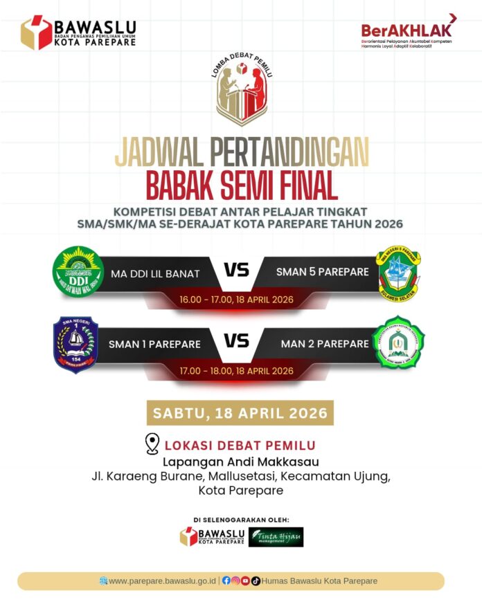 PAREPARE, RADIOMESRA. COM  — Kompetisi Debat Pemilu tingkat SMA/SMK/MA se-derajat Kota Parepare memasuki babak krusial. Setelah melalui rangkaian pertandingan sengit di babak penyisihan, kini empat tim terbaik berhasil melaju ke babak semi final yang akan digelar pada Sabtu, 18 April 2026, di Lapangan Andi Makkasau, Kota Parepare.