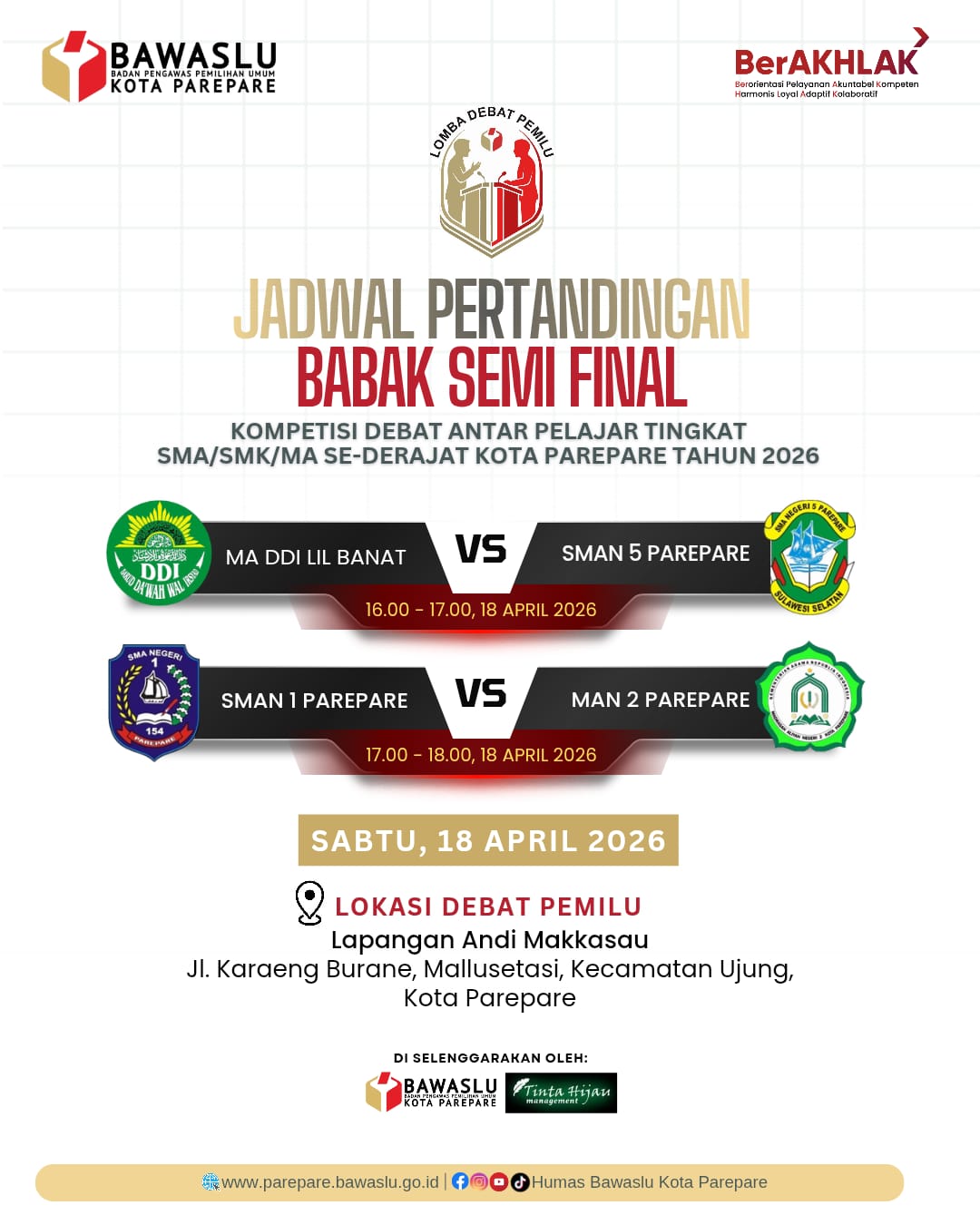 Bawaslu Kota Parepare mengajak masyarakat untuk turut hadir dan menyaksikan langsung jalannya semi final sebagai bentuk dukungan terhadap penguatan demokrasi di kalangan generasi muda.